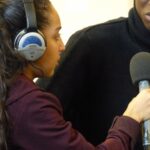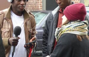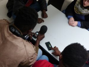 En petit groupe les jeunes s’exercent au jeu de l’interview : casque sur les oreilles, micro en main, il s’agit de se familiariser avec l’enregistreur.