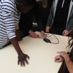 Par groupe de trois, les jeunes définissent le contenu de leur pastille : bruitage Beat box, faire résonner le bâtiment pour le découvrir autrement, Télégué (on vous dira ce que c’est une prochaine fois!), sons de Roubaix et de Guinée : parler des différences et points communs.
