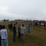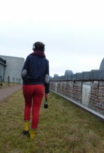 La visite n’est pas conventionnelle puisqu’il s’agit de percevoir le lieu dans sa dimension sonore (résonance, acoustique, claquement, grincement, pas sur la tôle des escaliers, dans l’herbe…).